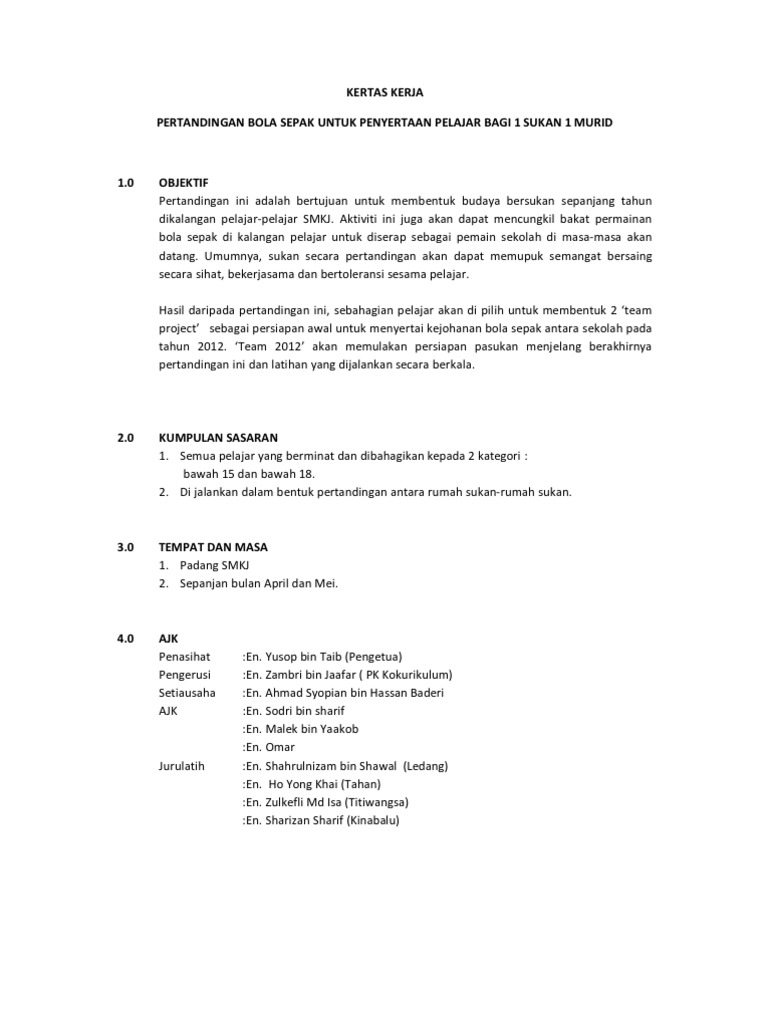 Kertas kerja sukan pasca upsr doc Murad Yok Kertas kerja bola baling Ainaa Najiha Peraturan pertandingan 7 sebelah amran ahmad Kertas kerja bola baling daerah 2017. Diambil bagi mempertahankan kualiti dan nama sekolah dalan permainan bola sepak. Kertas kerja-kejohanan-bola-sepak-9-sebelah 1.